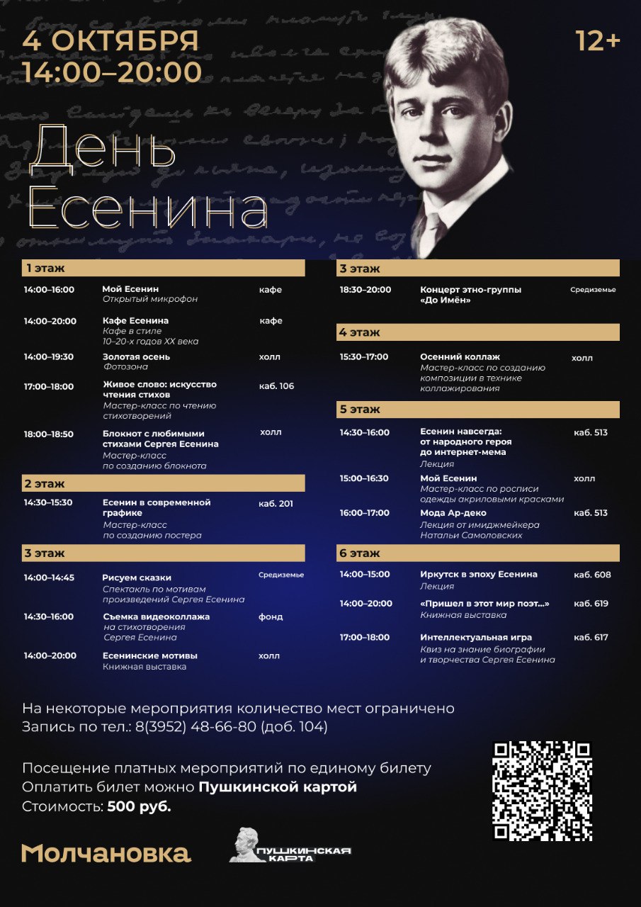 4 октября с 14:00 до 20:00 приглашаем провести субботу с Молчановкой!К 130-летию со дня рождения великого русского поэта библиотека готовит арт-выходной «День Есенина».